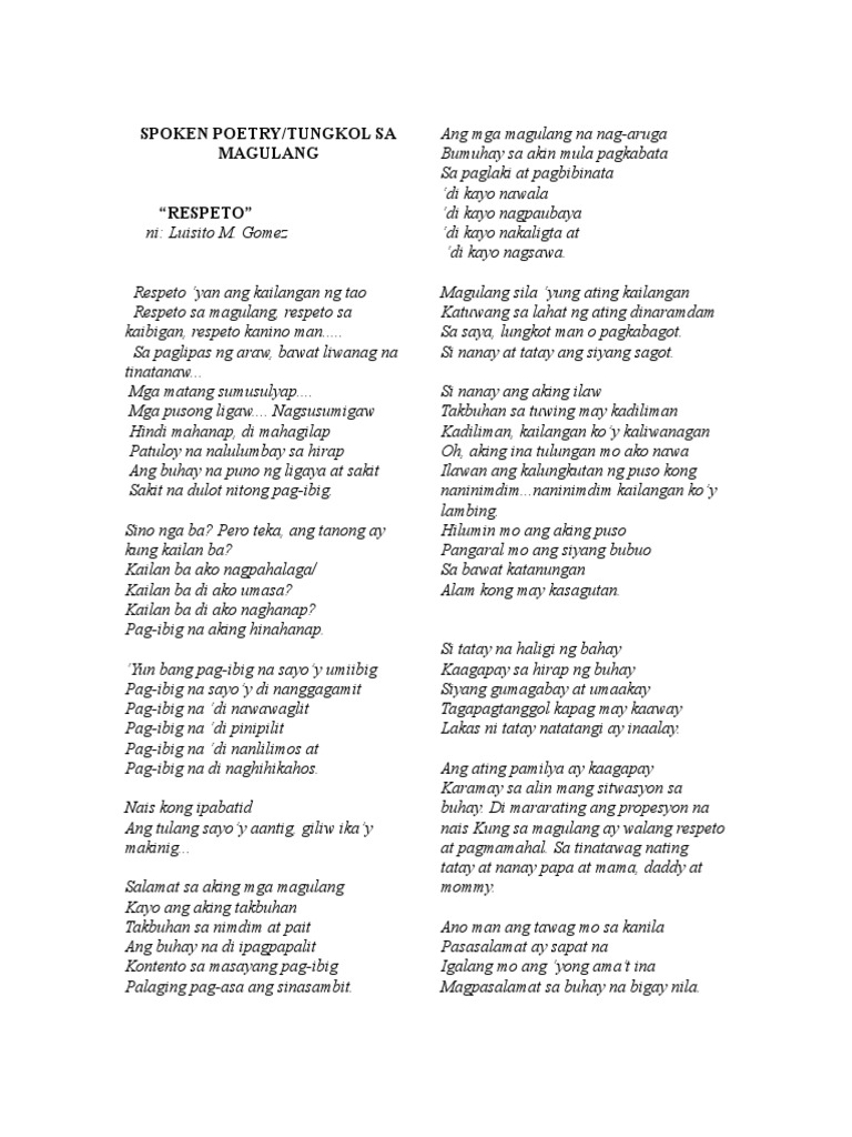 30122019 Examples Of Spoken Poetry In Tagalog. Mga bagong bayani Katapangan ay tinataglayFrontliners ay laging nakaagapaySa mga taong kailangan ng tulongSana po ay magustuhan ninyoAng ginawa kong spoken. Para sa lahat ng mga naliligaw ay may nanatiling tamang daan.