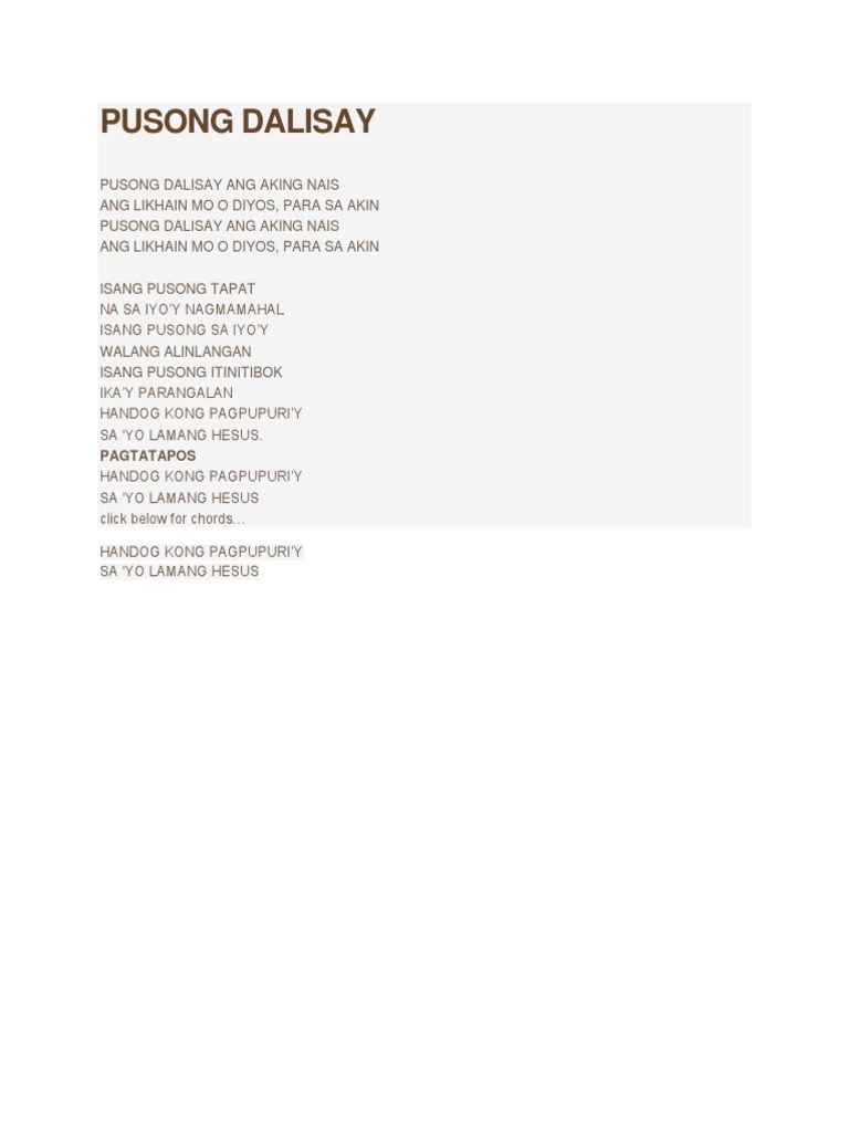PUSONG DALISAY D G pusong dalisay ang aking nais Em A D A na likhain mo o diyos para sa akin D G pusong dalisay ang aking nais Em A D Am7 D7 na likhain mo o diyos para sa akin G A isang pusong tapat Fm Bm na sayoy nagmamahal Em A D isang pusong sayoy walang Am7 D7 alinlangan G A Fm isang pusong tinitibok ikay Bm. Preparing the hearts of Gods peopleC FA pure heart thats what I long forDm G CA heart that follows hard af. Create and get 5 IQ.