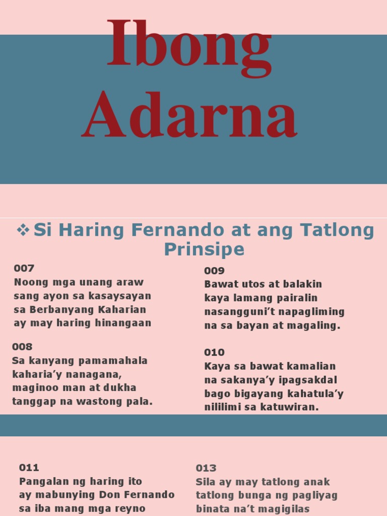 Siya din angnakahuli ng Ibong Adarna. Naging maganda ang Berbanya dahil sa mabuting pamumuno ni haring Fernando. Sino ang anak ni haring fernando na nag isip ng ka.