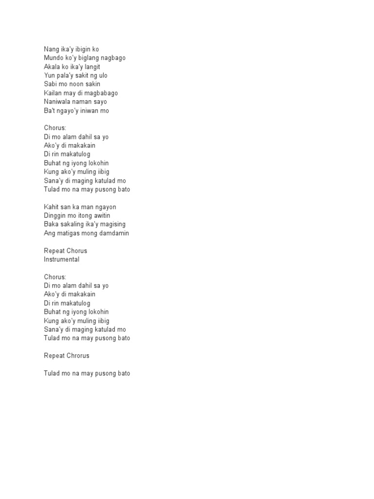 Ecouter et tlcharger Pusong bato en MP3. Tulad mo namay pusong bato Kahit san ka man ngayon Dinggin mo itong awitin Baka sakaling ikay magising Ang matigas mong damdamin Di mo alam dahil sayo Akoy di makakain Di rin makatulog Buhat ng iyong lokohin Kung akoy muling iibig Sanay di maging katulad mo Tulad mo namay pusong bato Di mo alam dahil sayo Akoy di makakain Di rin makatulog. 2017-07-29T060028Z Comment by Donna Jane Verba.