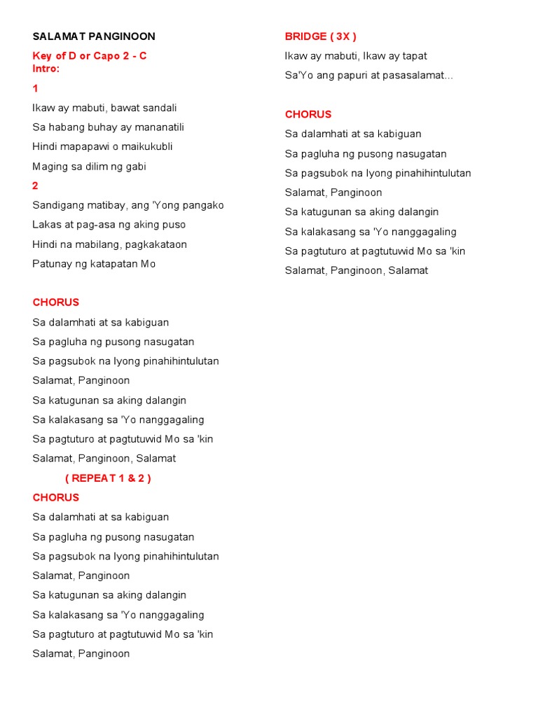 Sa katugunan sa aking dalangin. Sa dalamhati at sa kabiguan Sa pagluha ng pusong nasugatan Sa pagsubok na Iyong pinahihintulutan Salamat Panginoon Sa katugunan sa aking dalangin Sa kalakasang SaYo nanggagaling Sa pagtuturo at pagtutuwid Mo sakin Salamat Panginoon Salamat Chorus II. Sa dalamhati at sa kabiguan Sa pagluha ng pusong nasugatan Sa pagsubok na iyong pinahihintulutan Salamat Panginoon Sa katugunan sa aking dalangin Sa.